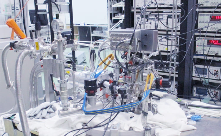 炭化水素ガスと二酸化炭素ガスから高純度水素ガス (99.9999%<純度) を大容量製造 (100ℓ毎時) する装置です。製造時に二酸化炭素の大気排出を伴わない「クリーン水素」の社会実装に向けて、先進触媒材料と反応システムの研究開発に利用されています。