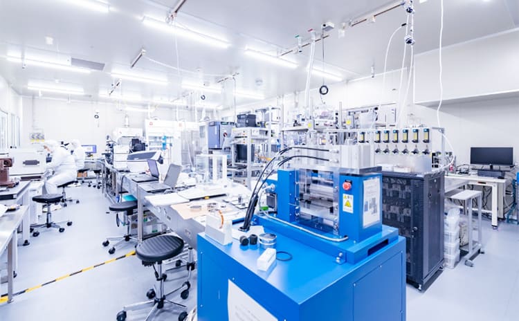 世界最高峰の精度を誇るスーパードライルームです。給気露点は-90℃以下、水分量はわずか0.1ppm以下と非常に低く、小型電池の試作から電池評価、分析評価に至るまで幅広く対応します。次世代蓄電池開発や分析に最適な非水環境を提供します。