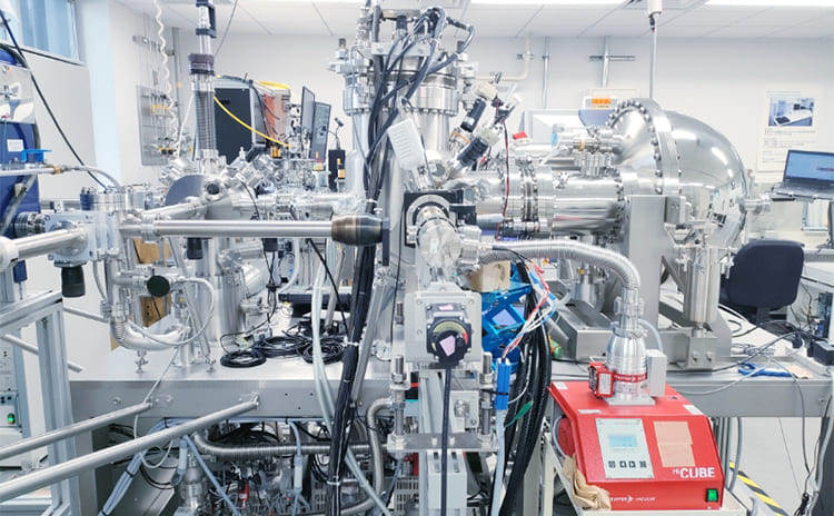 全自動コンピューター制御により複雑な薄膜構造を持つ試料を作製可能な装置です。スパッタ成膜、電子線蒸着、分子線エピタキシーを行うチャンバー間を自動搬送ロボットにより行き来することができ、幅広い基盤的な薄膜研究に活用できます。