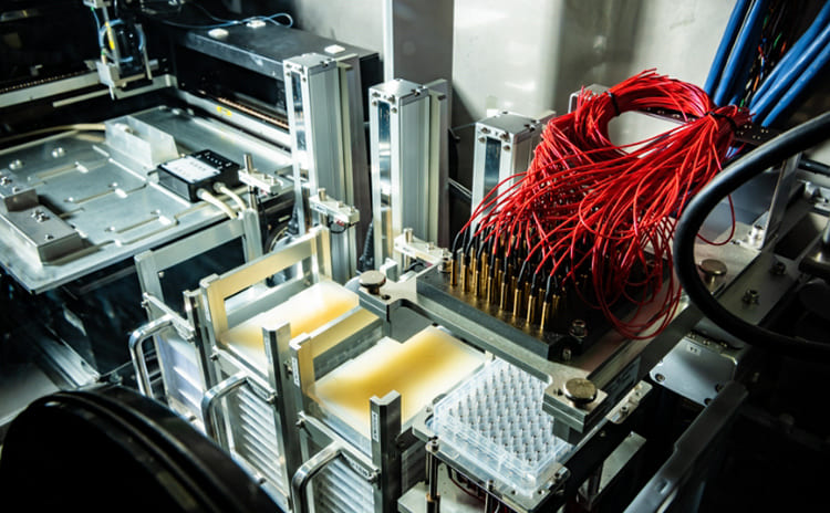 レート型電気化学セルの各穴に、正極・負極のシートとそれらを隔てるセパレータが仕込まれており、電解液の自動注入によって微小な電池セルができ上がります。これをロボットアームで計測部へと運び、充放電測定を行うというサイクルの自動化により、1日約1000サンプルもの評価が可能になります。