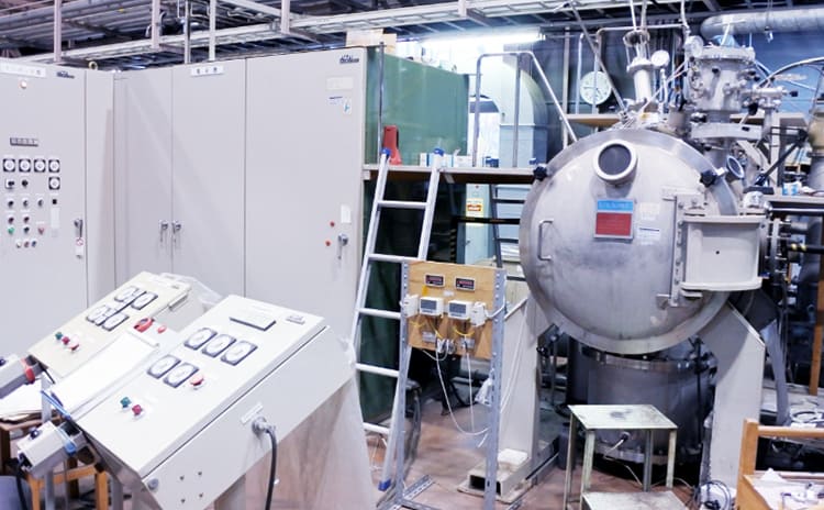 溶解量はチタン換算で1.2kg。150kWと100kWを合わせた浮上力と加熱の役割を集中させた2重電源方式の高周波誘導溶解炉です。 特徴は、1.急速溶解が可能。2.高純度・高融点金属の溶解が可能。3. 均一組成の合金溶製。4. 自由なフラックス選択が可能。5.電磁気力による溶湯の活発な撹拌で精錬反応の促進。