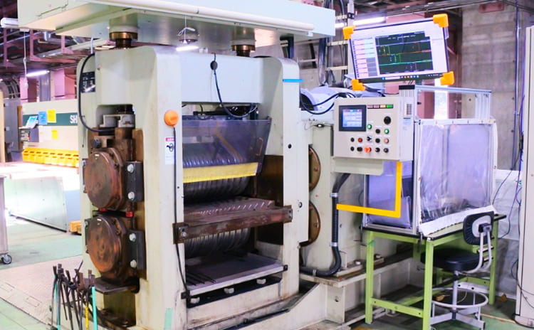 圧延速度を1~30m/minまで無段階で制御可能な溝ロール圧延機です。溝は◇40mmから◇7.9mmまで備えており、圧延速度、荷重、単色放射温度計による圧延前後の試料温度測定、トルクの収集が可能です。大トルクモーターも搭載しており、棒材試料の作製に幅広くご利用いただいております。