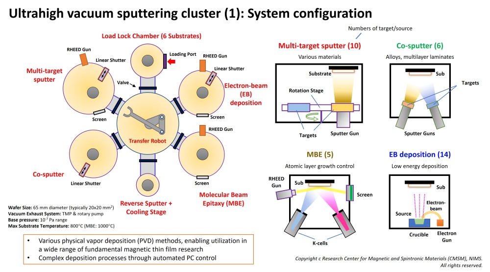 Furthermore, RHEED (Reflection High Energy Electron Diffraction) system enables crystallographic evaluation of the sample surface during thin film growth (in EB, MBE chambers) and immediately after deposition. Each chamber is also equipped with a linear shutter system, supporting the fabrication of wedge-shaped film structures with automatically modulated film thickness. The combined use of RHEED and the linear shutter enables efficient optimization of conditions for thin-film devices such as TMR devices.