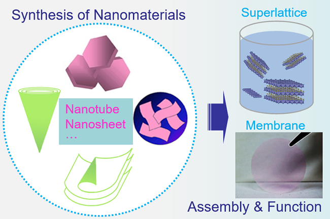 We exploit the most advanced chemical synthesis technologies toward rational design and function exploration of new nanomaterials represented by nanotubes and nanosheets. By assembling and integrating these nanoscale building blocks, we are striving to achieve novel multi-functions for applications in batteries, ion conductors and catalysts, etc.
