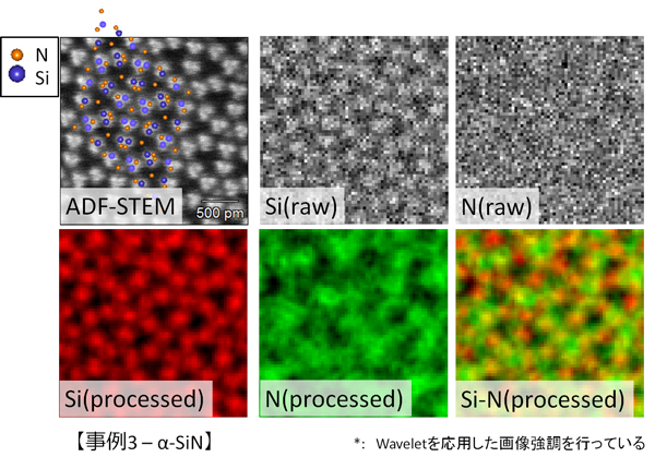 | Images | ![]() The specimen used is an a-type SiN. You can see from the processed N map, that the strength is certainly stronger on the N site. Typically, it is said that EDS is not suited for light elements, but if channeling can be used as in the case of crystalline samples, EDS analysis is not impossible even for atomic resolutions. |