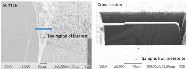千現地区 精密計測実験棟 115室FIB(集束イオンビーム)でバルク試料からTEM薄膜試料片を直接製作する装置です。サブミクロン精度で興味のある場所のTEM試料作製が出来ます。FIB内で加工・分離をした試料片をピックアップシステムによりメッシュ上へ接着することも可能です。