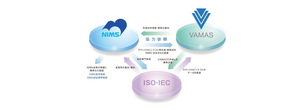 NIMSは先進材料研究の中核機関として、VAMAS Japanを取りまとめています。VAMAS Japanは、VAMASとの連携により諸外国との国際交流を図り、国内外の研究機関との研究成果をもとに、日本主導の規格の提案や国際標準化を目指し、活動を続けています。
