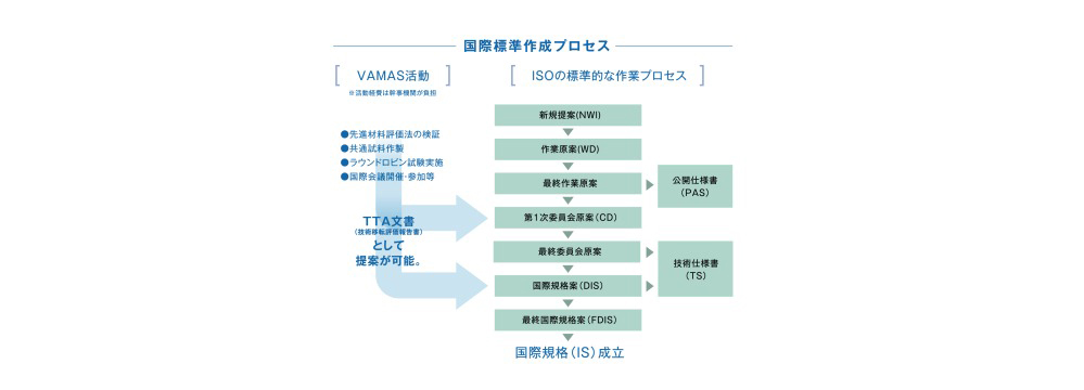 G7サミットで合意され、先端技術製品の貿易や経済的交流を活性化することを目的として発足したVAMASは、先進材料の標準化に関する国際協力プロジェクトとして、ISO(国際標準化機構)とリエゾンを結び、ISOやIEC(国際電気標準会議)に新材料に関する標準法案を提出し、国際標準化を促進しています。
